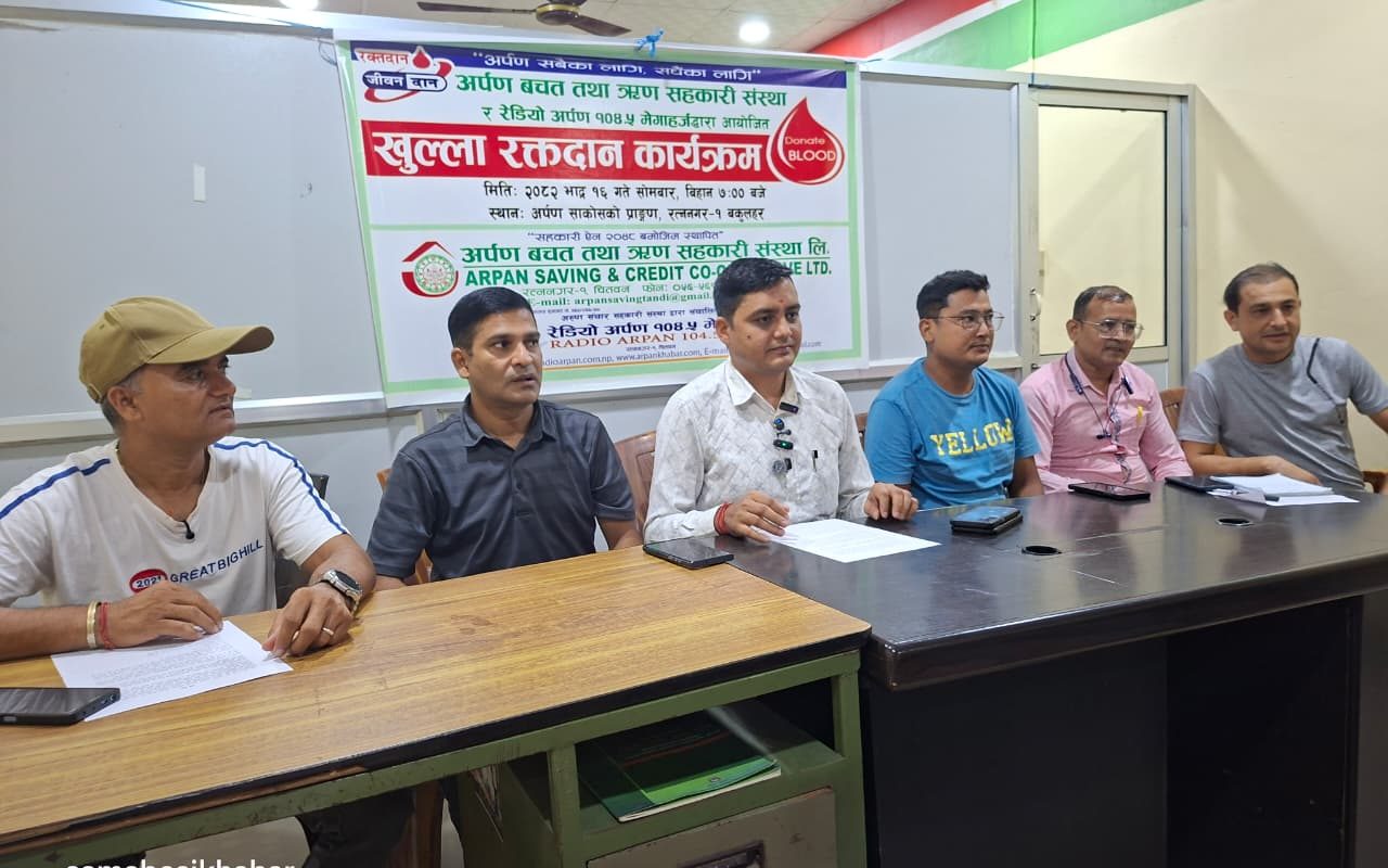 रतननगर, १३ भाद्र । अर्पण बचत तथा ऋण सहकारी संस्था लिमिटेडले १६औं स्थापना दिवसको अबसरमा यही भदौं १६ गते रक्तदान कार्यक्रम गर्ने भएको छ । रेडियो अर्पण १०४.५ मेगाहर्जको संयुक्त सहकार्यमा आयोजना गरिएको रक्तदान कार्यक्रम विहान ७ बजे बाट अर्पण साकोसको प्राङगढमा सुरु हुने छ ।