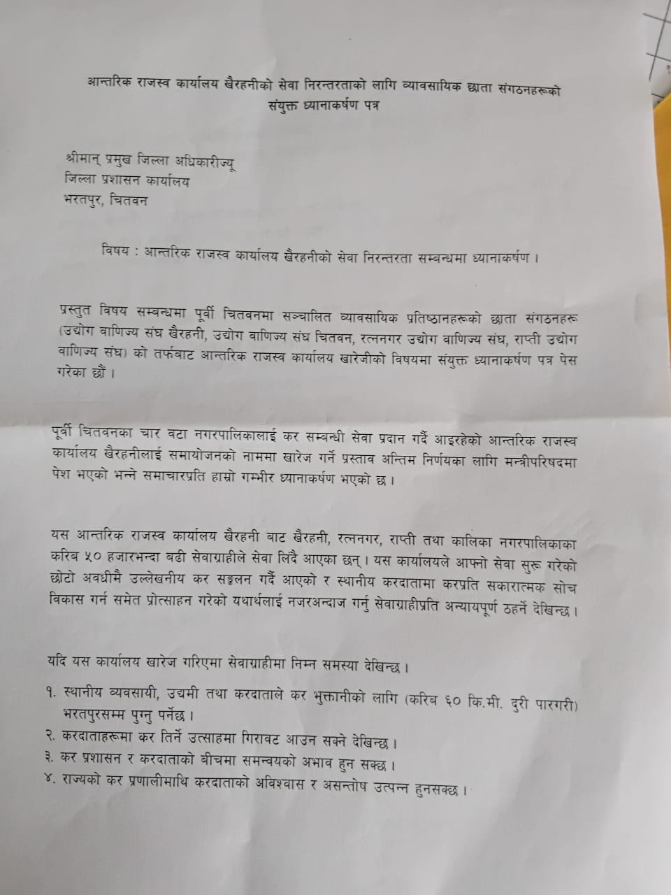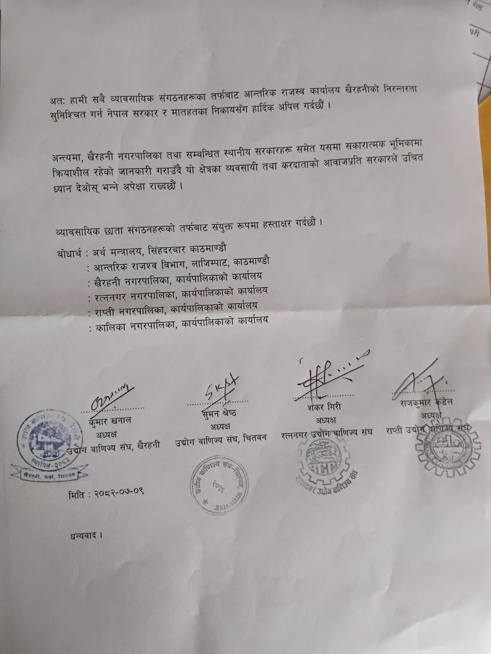 खैरहनीको आन्तरिक राजस्व कार्यालय नहटाउन उद्योग वाणिज्य संघहरुको ध्यानाकर्षण