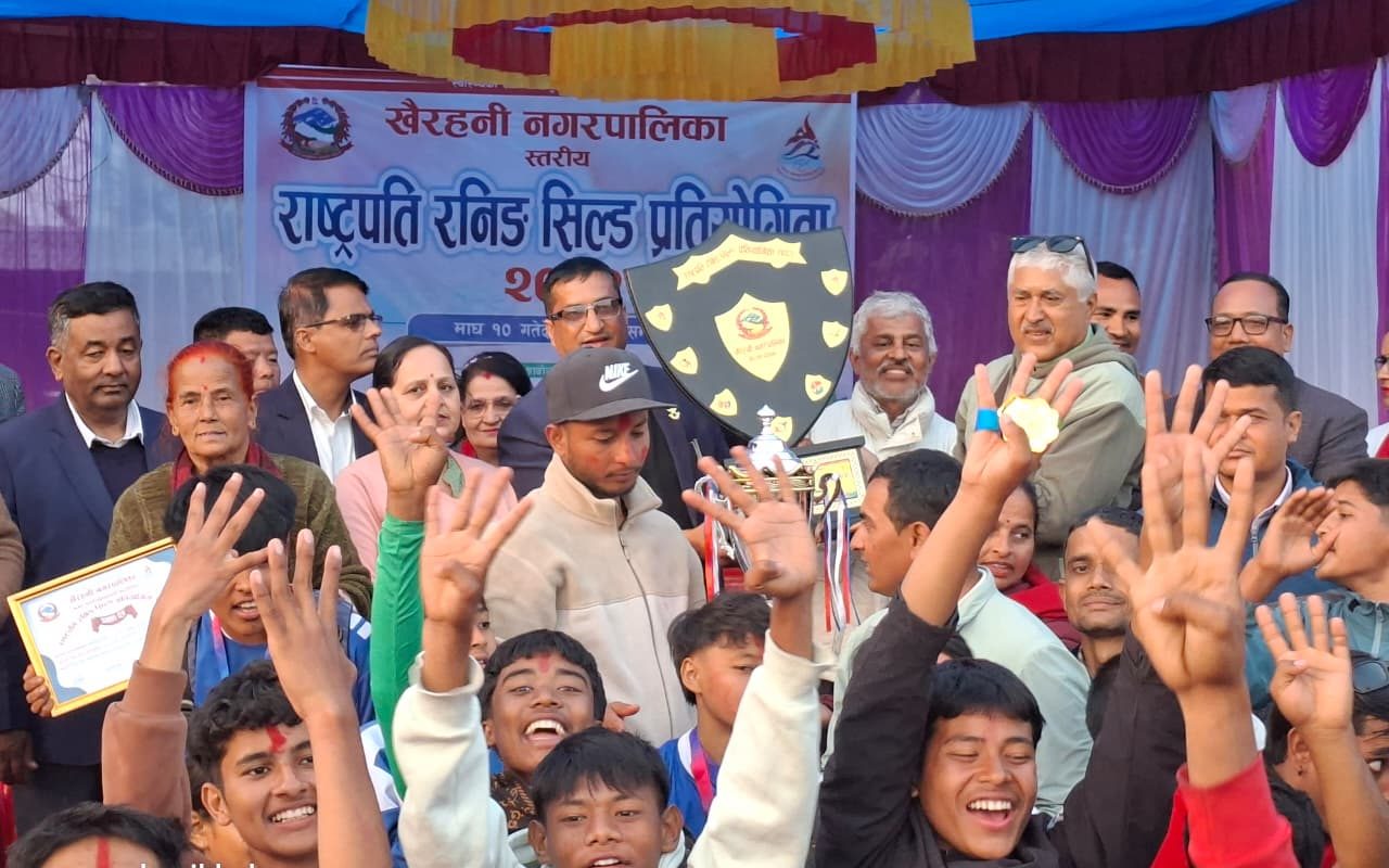 चितवन, १२ माघ । खैरहनी नगरपालिकामा संचालित रास्ट्रपति रनिङ शिल्ड प्रतियोगिता २०८२ को उपाधी माध्यमिक विद्यालय गवैले जितेको छ । तीन दिनसम्म चलेको सो प्रतियोगितामा १७ स्वर्ण ,९ रजत र १२ कास्य पदक जित्दै यस बर्षको उपाधी जितेको हो । गवैले यस अघि लगातार तीन पटक उपाधी जित्दै रनिङ शिल्ड आफ्नो बनाएको थियो । गवै पछिल्लो समय शैक्षिक गुणस्तर सुधारमा पनि अब्बल बनाउदै लगेको छ । दोस्रो भएको सैनिक आवासीय महाविद्यालयले १० स्वर्ण ,९ रजत र १३ कास्य पदक जितेको छ । तृतीय स्थानमा रहेको ७ स्वर्ण,७ रजत र ८ कास्य पदक जितेको शिक्षा अधिकृत सुमन सिलवालले जानकारी दिइन् । प्रतियोगितामा सामुदायिक र संस्थागत गरि २२ वटा विद्यालयको सहभागिता रहेको थियो ।