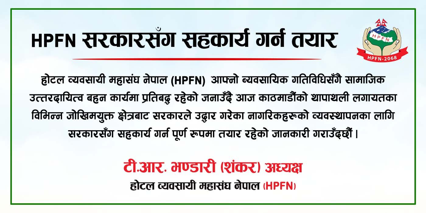 ‘होटल व्यवसायी महासंघ नेपाल आफ्नो व्यवसायिक गतिविधिसँगै सामाजिक उत्तरदायित्व बहन कार्यमा प्रतिबद्ध रहेको जानकारी गराउँदै आज काठमाडौंका थापाथली लगायतका विभिन्न जोखिमयुक्त क्षेत्रबाट सरकारले उद्धार गरेका नागरिकहरूको सुरक्षित व्यवस्थापनका लागि सरकारसँग सहकार्य गर्न पूर्ण रूपमा तयार रहेको जानकारी गराउँदछौँ ।’ महासंघले भनेको छ ।